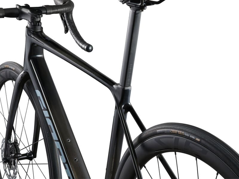 - Strategisch konstruierte Profilabschnitte im Rahmen und in der Gabel, die mit Hilfe von CFD- und Windkanaltests entwickelt wurden, verbessern die aerodynamische Effizienz und reduzieren den Luftwiderstand.