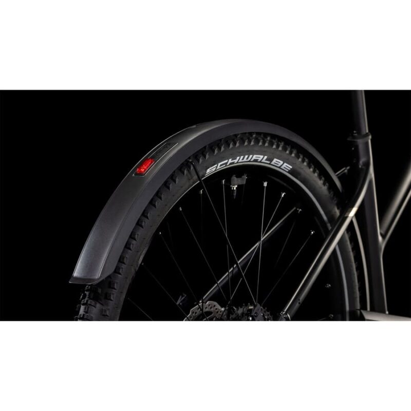 Mit den leistungsstarken hydraulischen Scheibenbremsen von Shimano wird sicher und kontrolliert gebremst. Für extra Fahrkomfort auf holprigen Wegen haben CUBE sich für eine Suntour Luftfedergabel im Team mit breiten, griffigen Schwalbe Reifen entschieden. Last, but not least das Zubehör, bestehend aus Schutzblechen, Lichtanlage und Seitenständer. Damit steht dieses Bike allzeit für jede Tour bereit.