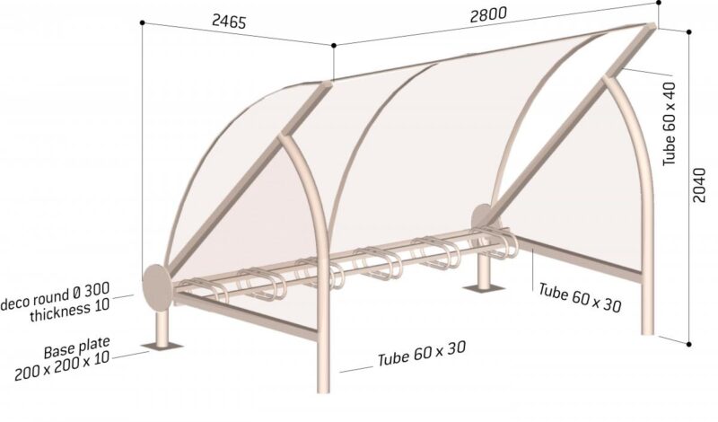 Außerdem verfügt die Fahrradüberdachung über einen Fahrradständer mit 6 Stellplätzen. Das Material ist Ø 22 mm und aus feuerverzinktem Stahlrohr. Sowohl das Gestell, als auch die Fahrradständer sind in 10 verschiedenen RAL-Farben erhältlich. Die Farbe der Stellplätze ist in der selben Farbe pulverbeschichtet wie das Gestell.