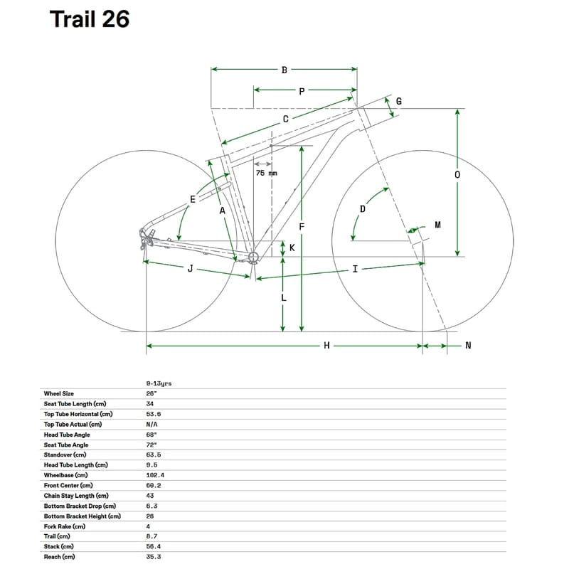26-Zoll-Räder in voller Größe fressen Unebenheiten zum Frühstück und rollen mühelos über Wurzeln. Sie sind wendiger als die größeren 27,5-Zoll-Räder, die man bei vielen Erwachsenenrädern findet. Die niedrige Überstandshöhe sorgt für Stabilität und bietet viel Platz zum Wachsen.