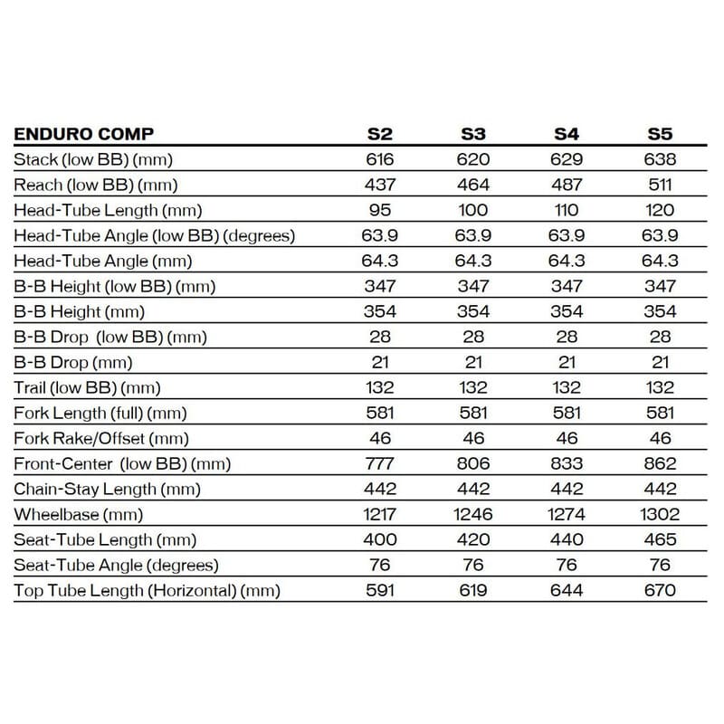 Schnelligkeit und Passform schließen einander nicht aus, weshalb die progressive Geometrie des Enduro neben bergab auch bergauf bestens funktioniert. Der Unterschied zwischen den Sitzrohrlängen und Stack fällt zwischen den verschiedenen Rahmengrößen hier nicht groß aus, sodass du nun eigentlich jede Rahmengröße wählen kannst, die sowohl deiner Körpergröße als auch deinem Fahrstil entspricht. Mit dem nun flacheren Steuerrohrwinkel, größeren Reach und einem steileren Sitzrohr über alle Größen erhältst du ein schnelleres und leistungsfähigeres Bike – unabhängig von der Größe.