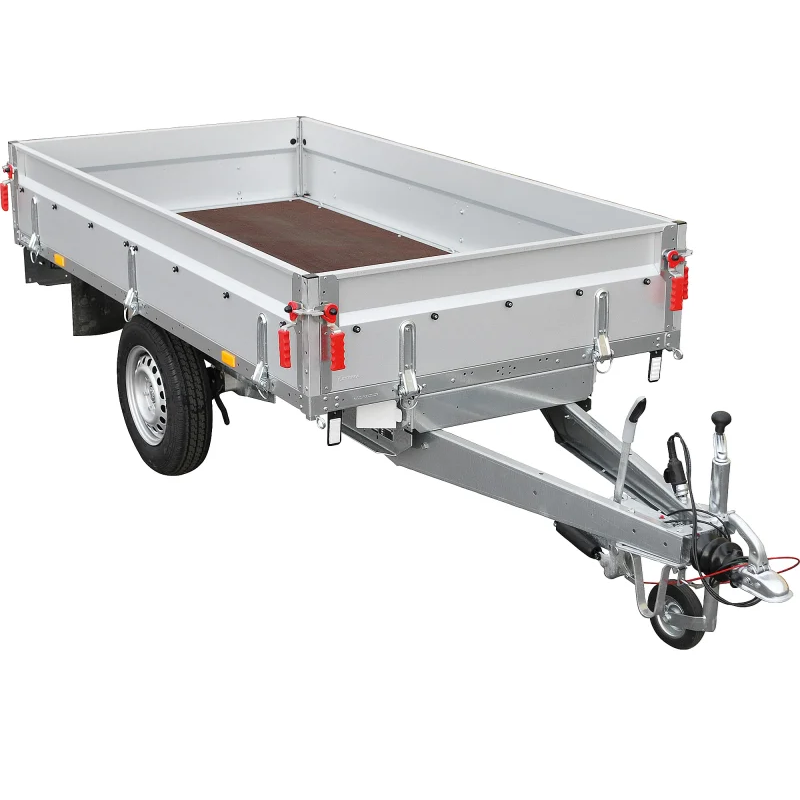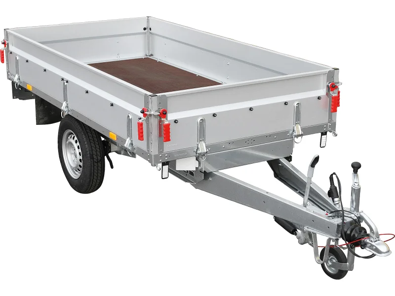Als Hochladerausführung (Räder unter der Ladefläche) können alle 4 Seitenwände nach unten geklappt und/oder entfernt werden. So kann der Anhänger auch von der Seite einfach mit einem Stapler mit beispielsweise Palettenwaren beladen werden.