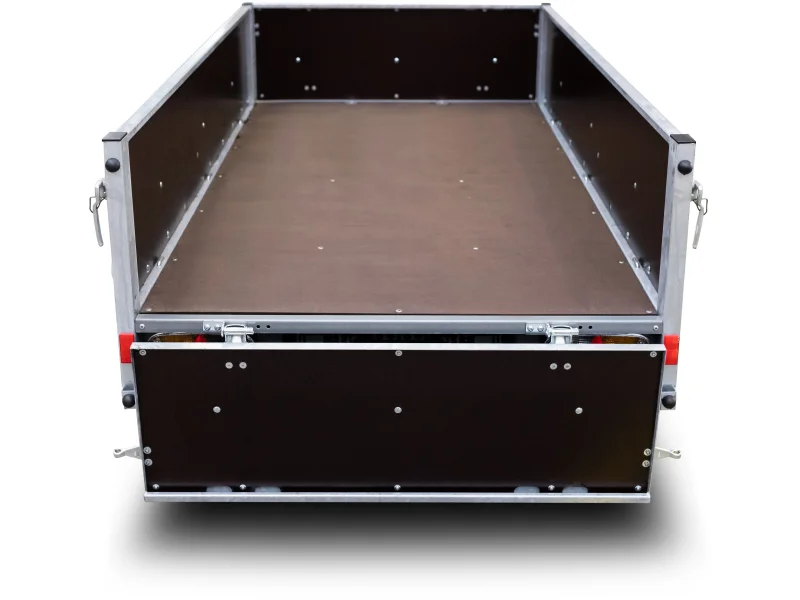 - Robuster Anhänger mit 40 cm hohen Holzwänden